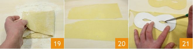 Wiederholen Sie die Schritte in der Maschine, indem Sie den Teig jedes Mal falten 19, bis Sie eine Dicke von etwa 1 mm 1/2 20 erreichen. Schneiden Sie den Teig aus, indem Sie hier das Schablone der Karnevalsmaske (12-13 cm lang und 6-7 cm hoch) herunterladen. Schneiden Sie auch die Augen mit der Spitze eines scharfen Messers aus 21.