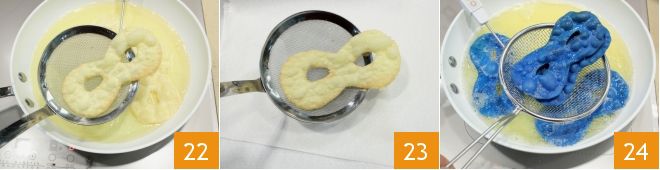 Frittieren Sie die Masken in reichlich Pflanzenöl 1 Minute pro Seite (achten Sie darauf, dass das Öl die Temperatur von 170° nicht überschreitet) 22, dann auf Küchenpapier abtropfen lassen 23. Gehen Sie dann mit dem blauen Teig genauso vor: Führen Sie den Teig durch die Maschine, ziehen Sie die Platte auf 1 mm 1/2 Dicke, schneiden Sie die Masken aus und frittieren Sie sie in reichlich Pflanzenöl, dann abtropfen lassen 24