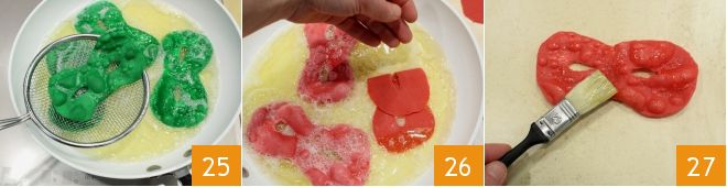 Bereiten und kochen Sie auch die grünen 25 und roten 26 Masken. Sobald sie abgetropft und abgekühlt sind, können Sie die bunten Masken mit Honig bestreichen 27