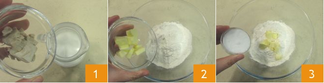 Um die Arancini di Carnevale zuzubereiten, erwärmen Sie zuerst leicht die Milch und lösen Sie dann die Hefe darin auf 1, indem Sie mit einem Löffel umrühren. Geben Sie das Mehl in eine große Schüssel, fügen Sie die erweichte Butter 2 und den Zucker 3 hinzu