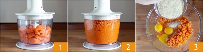 Um den Karotten-Mandel-Kuchen zuzubereiten, schneiden und schälen Sie zuerst die Karotten, dann schneiden Sie sie in Stücke und geben Sie sie in einen Mixer 1. Mixen Sie, um sie fein zu zerkleinern 2, dann geben Sie sie in eine Schüssel zusammen mit den Eiern und dem braunen Zucker 3.