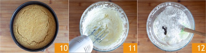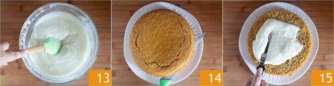 Gut mit einem Spatel mischen 13. Zu diesem Zeitpunkt sollte die Torte abgekühlt sein, also lösen Sie sie aus der Form und legen Sie sie auf einen Servierteller. Schneiden Sie die Torte mit einem langen, gezackten Messer horizontal, um zwei Schichten zu erhalten 14. Bestreichen Sie die erste Schicht mit der Hälfte des Frostings 15.
