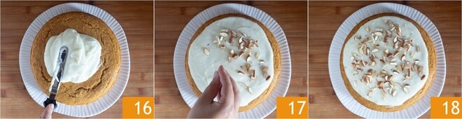 Bedecken Sie mit der anderen Hälfte der Torte und bestreichen Sie die Oberfläche mit dem restlichen Frosting 16. Schließlich mit den Mandelblättchen garnieren 17. Ihr Karotten-Mandel-Kuchen ist bereit zum Servieren 18!