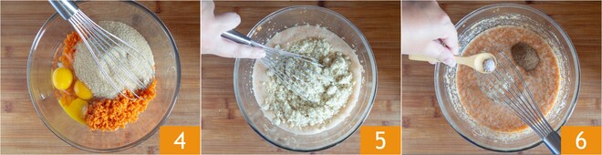 Mischen Sie alles mit einem Schneebesen 4, dann fügen Sie das Pflanzenöl und das Mandelmehl hinzu und mischen Sie erneut 5. Fügen Sie den Zimt und eine Prise Salz hinzu 6.