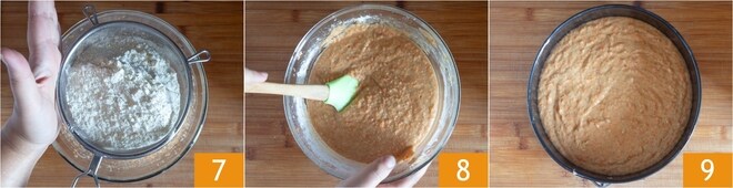 Zum Schluss sieben Sie das Mehl und das Backpulver 7. Integrieren Sie die trockenen Zutaten mit einem Spatel, bis Sie einen homogenen und klumpenfreien Teig erhalten 8. Gießen Sie den Teig in eine 22 cm Durchmesser Backform, die Sie zuvor eingefettet haben (alternativ können Sie Backpapier verwenden) 9. Backen Sie im statischen Ofen bei 180° etwa 40 Minuten lang.