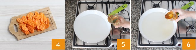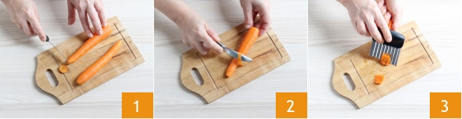 Um die Karotten mit Senf zuzubereiten, waschen Sie zunächst die Karotten gründlich. Dann schneiden Sie die Enden ab 1 und schälen sie 2. Verwenden Sie eine gezackte Klinge, um Karottenscheiben in einem schrägen Schnitt herzustellen 3.