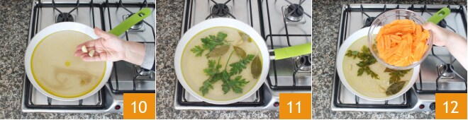 Fügen Sie die 2 Knoblauchzehen 10, die Lorbeerblätter und 2 Büschel Petersilie 11 hinzu. Bringen Sie alles zum Kochen, geben Sie dann die Karotten hinzu 12 und lassen Sie sie bei mittlerer Hitze etwa 15-20 Minuten kochen. Sie sollten weich, aber fest sein.