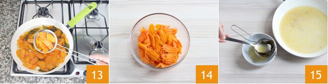 Jetzt verwenden Sie ein Sieb, um die Karotten abzugießen 13 und in eine Schüssel zu geben 14. Lassen Sie den Kochfond weitere 10 Minuten bei starker Hitze einkochen, dann filtern Sie ihn 15,