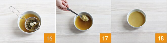 um den Knoblauch und die Kräuter 16 zu entfernen. Lassen Sie ihn abkühlen, dann geben Sie den Senf hinzu 17 und rühren, um die Zutaten zu verbinden 18.