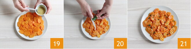 Geben Sie die Karotten auf einen Servierteller, wobei Sie darauf achten, sie nicht zu überlappen. Würzen Sie mit der Senfsauce 19 und geben Sie gehackte Petersilie darüber 20. Die Karotten sind bereit zum Servieren 21!