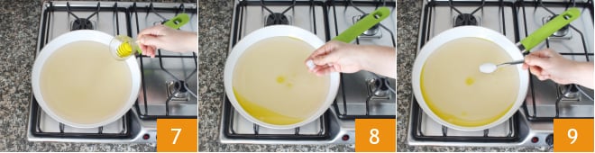 das Öl 7, eine Prise Salz 8 und einen Teelöffel Zucker 9.