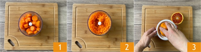 Um den Karottenkuchen ohne Eier zuzubereiten, schälen Sie zuerst die Karotten, schneiden Sie sie in grobe Stücke und geben Sie sie in den Mixer 1. Pürieren Sie sie, bis sie zu feinen Stücken werden 2. Pressen Sie die Orange 3; Sie benötigen 60 g Saft.