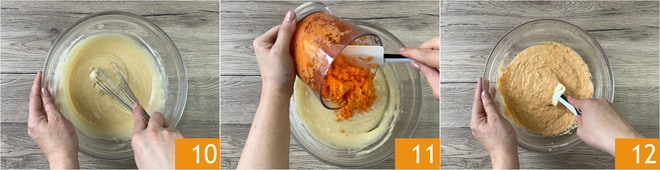 Rühren Sie, bis Sie einen glatten, klumpenfreien Teig erhalten 10. Fügen Sie schließlich die Karotten hinzu 11 und vermischen Sie sie mit dem Teig 12.