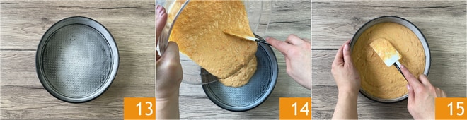 Fetten und mehlen Sie eine 22 cm Form 13, gießen Sie den Teig hinein 14 und glätten Sie ihn mit einem Spatel. Backen Sie im vorgeheizten Ofen bei 180° für etwa 30 Minuten.