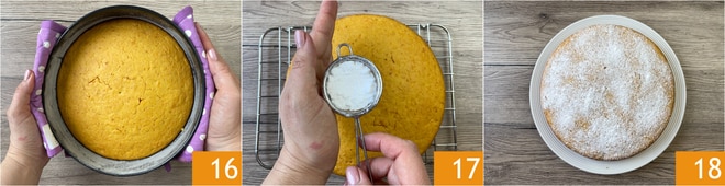 Nehmen Sie den Kuchen aus dem Ofen, lassen Sie ihn abkühlen 16 und bestäuben Sie ihn mit Puderzucker 17. Der Karottenkuchen ohne Eier ist bereit zum Genießen 18.