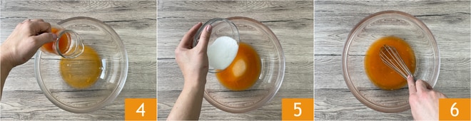 Geben Sie in eine Schüssel das Wasser, den Orangensaft 4 und den Zucker 5 und rühren Sie dann mit dem Schneebesen um 6.
