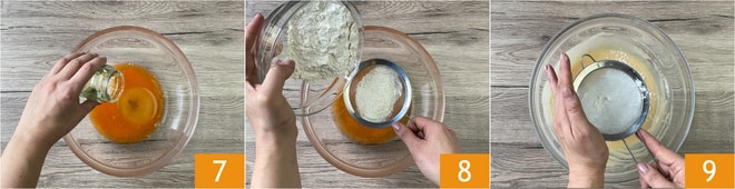Gießen Sie auch das Sonnenblumenöl 7 hinzu und mischen Sie erneut. Sieben Sie das Mehl und fügen Sie es zu den Flüssigkeiten hinzu 8. Machen Sie dasselbe mit der Stärke und dem Backpulver 9.