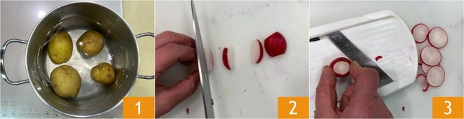 Um den Kartoffel-Brokkoli-Auflauf zuzubereiten, kochen Sie zuerst die Kartoffeln in kaltem Wasser und zählen Sie 25 Minuten ab dem Siedepunkt 1. In der Zwischenzeit kümmern Sie sich um das eingelegte Gemüse: Schneiden Sie ein Radieschen in Viertel 2 und eines in dünne Scheiben 3.