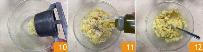 Wenn die Kartoffeln gar sind, lassen Sie sie abtropfen und zerdrücken Sie sie noch heiß in einer Schüssel 10, dann würzen Sie sie mit Öl 11, Salz und Pfeffer. Mischen Sie alles 12 und stellen Sie es beiseite.