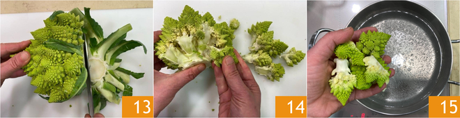 Kümmern Sie sich um den Romanesco-Brokkoli: Entfernen Sie den Stiel und die Blätter 13, dann trennen Sie die Röschen 14 und blanchieren Sie sie einige Minuten in kochendem Salzwasser 15.