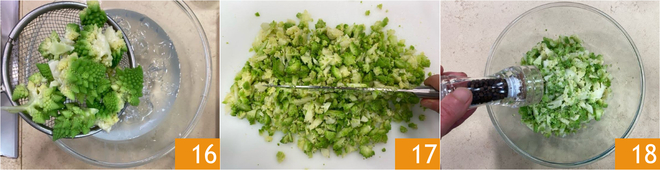 Lassen Sie die Brokkoli abtropfen und geben Sie sie in eine Schüssel mit Eiswasser, um die Farbe zu bewahren 16, dann hacken Sie sie grob mit einem Messer 17, wobei Sie einige Röschen für die endgültige Dekoration beiseite lassen. Sammeln Sie die Brokkoli in einer Schüssel und würzen Sie mit Öl, Salz und Pfeffer 18.