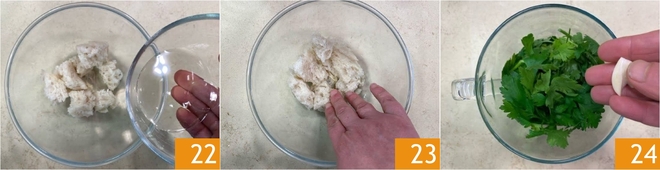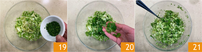 Aromatisieren Sie mit gehackter Petersilie 19, Minze und Basilikum 20, dann mischen Sie gut und stellen Sie es beiseite 21.