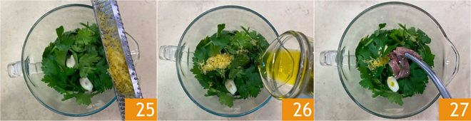 Fügen Sie die geriebene Zitronenschale 25, das Öl 26 und die Sardellen 27 hinzu.