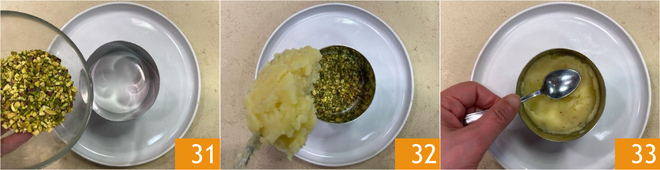 Sie sind bereit, Ihre Aufläufe zusammenzustellen: Legen Sie auf den Teller einen Ausstechring mit einem Durchmesser von... cm, ca.... cm hoch, und streuen Sie die Pistazienbasis hinein 31. Geben Sie eine großzügige Schicht Kartoffeln hinzu 32 und drücken Sie sie mit dem Rücken eines Teelöffels gut an, um sie zu glätten 33.