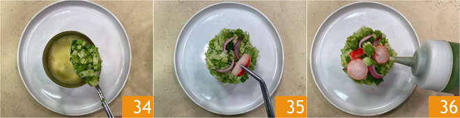Fügen Sie auch eine Schicht Brokkoli hinzu, bis Sie den Rand des Ausstechrings erreichen 34, drücken Sie leicht an und entfernen Sie den Ring. Garnieren Sie die Oberfläche des Auflaufs mit den eingelegten Gemüse 35, den beiseitegelegten ganzen Röschen und ein paar Tropfen grüner Sauce 36.