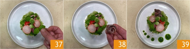 Zum Schluss vervollständigen Sie mit einigen Basilikum- und Minzblättern 37, einem Sardellenfilet 38 und noch ein paar Tropfen grüner Sauce an der Seite. Ihr Kartoffel-Brokkoli-Auflauf ist bereit zum Servieren 39!