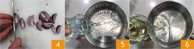 Schälen Sie die Zwiebel und schneiden Sie sie in unterschiedlich dicke Spalten, um verschiedene Konsistenzen zu gewährleisten 4. Sammeln Sie das Gemüse in einer Schüssel. Geben Sie das Wasser 5 und den Essig 6 in einen kleinen Topf.