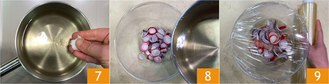 Fügen Sie eine Prise Salz hinzu 7 und erhitzen Sie es auf dem Herd, bis das Salz sich aufgelöst hat. Gießen Sie die Mischung in die Schüssel mit dem Gemüse 8, decken Sie sie mit Frischhaltefolie ab 9 und lassen Sie sie ruhen, während Sie mit dem Rezept fortfahren.
