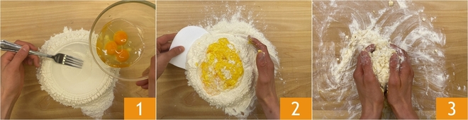 Um die Kartoffel-Cappellacci mit Taleggio-Fondue zuzubereiten, beginnen Sie mit der frischen Pasta: Geben Sie das Mehl als Hügel auf die Arbeitsfläche, dann fügen Sie nach und nach die Eier hinzu und mischen mit einer Gabel 1. Kneten Sie von Hand, helfen Sie sich mit einem Teigschaber 2, um das Mehl besser aufzunehmen 3.