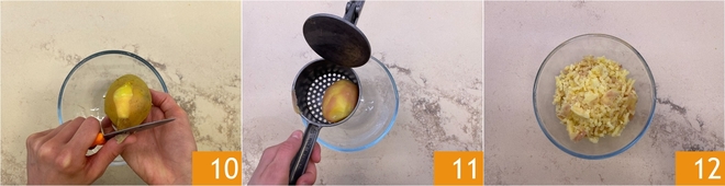 Wenn die Kartoffeln gekocht sind, schälen Sie sie 10 und drücken Sie sie mit einem Kartoffelstampfer 11 in eine Schüssel 12.