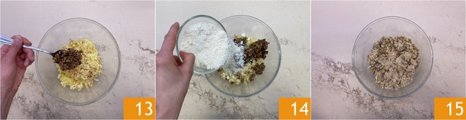 Fügen Sie die Pilze 13, den geriebenen Grana Padano DOP 14 hinzu, salzen, pfeffern und mischen 15.