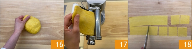 Nehmen Sie den Teigball 16, flachen Sie ihn mit den Händen oder mit einem Nudelholz ab, dann rollen Sie ihn mit der Nudelmaschine auf der breitesten Dicke aus 17. Falten Sie die Ränder nach innen, rollen Sie auf der breitesten Dicke aus und fahren Sie so fort bis zur vorletzten Dicke von etwa 2 mm. Glätten Sie den Teig und schneiden Sie ihn in Quadrate von 7x7 cm 18.