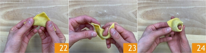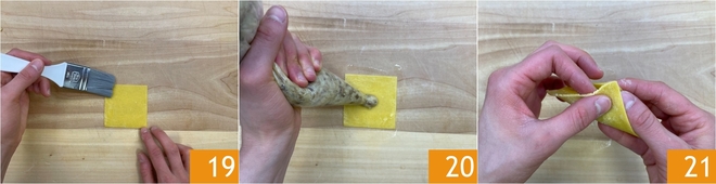 Bestreichen Sie die Ränder mit Wasser 19, dann geben Sie die Füllung in einen Spritzbeutel und drücken Sie einen Klecks Füllung in die Mitte des Teigquadrats 20. Jetzt formen Sie die Cappellacci: Falten Sie das Quadrat diagonal, sodass die Ecken übereinstimmen 21.