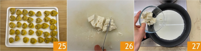 Während Sie sie schließen, legen Sie die hausgemachten Cappellacci auf ein Tablett 25. Fahren Sie mit der Sauce fort: Schneiden Sie den Taleggio in kleine Stücke 26. Erhitzen Sie die Sahne in einer Pfanne, dann fügen Sie den Taleggio hinzu 27.