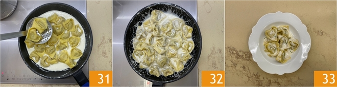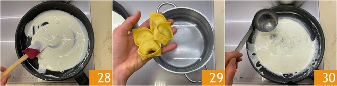Lassen Sie den Käse unter Rühren schmelzen 28, dann passen Sie das Salz und den Pfeffer an. Kochen Sie die Ravioli in kochendem Salzwasser 29, es dauert etwa 8 Minuten; In der Zwischenzeit geben Sie in die Pfanne eine Kelle Kochwasser 30.