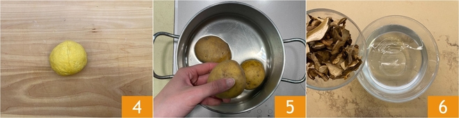Formen Sie einen Teigball 4, decken Sie ihn mit Frischhaltefolie ab und lassen Sie ihn etwa 30 Minuten an einem kühlen und trockenen Ort ruhen. In der Zwischenzeit kümmern Sie sich um die Füllung: Kochen Sie die Kartoffeln mit Schale aus kaltem Wasser für etwa 30 Minuten, die Zeit kann je nach Größe variieren 5. In der Zwischenzeit legen Sie die getrockneten Pilze für die auf der Packung angegebene Zeit in lauwarmes Wasser ein 6.