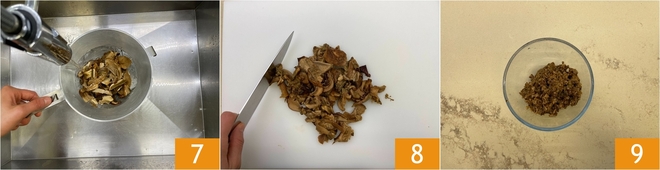 Sobald sie weich sind, die Pilze abtropfen lassen und abspülen 7, dann hacken 8 und beiseite stellen 9.