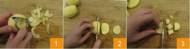 Um die Kartoffelsuppe zuzubereiten, beginnen Sie damit, die Gemüsebrühe in einem Topf zum Kochen zu bringen. Dann kümmern Sie sich um die Kartoffeln: schälen Sie sie 1 und schneiden Sie sie in Scheiben 2 und dann jede Scheibe in Würfel von etwa 1 Zentimeter 3.