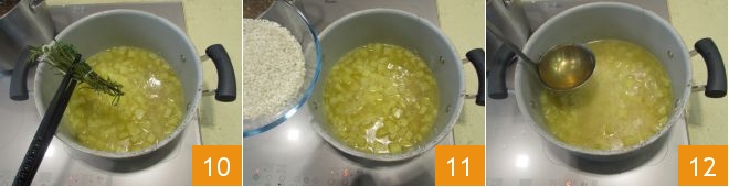 Nach 20 Minuten entfernen Sie das Kräuterbündel mit einer Küchenzange 10 und fügen den Reis hinzu 11. Sie können sowohl Arborio- als auch Carnarolireis verwenden. Geben Sie erneut die kochende Brühe hinzu, bis alles Reis und die Kartoffeln bedeckt sind 12.