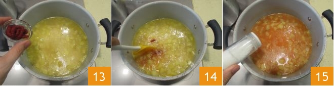 Fügen Sie dann das Tomatenmark hinzu 13 und rühren Sie gut um, um es zu vermischen 14. Fügen Sie auch das Salz hinzu 15