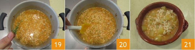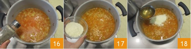 und den Pfeffer 16 und kochen Sie für weitere 20 Minuten, wobei Sie bei Bedarf mehr Brühe hinzufügen. Wenn der Reis und die Kartoffeln gar sind, fügen Sie den Grana Padano hinzu 17, rühren Sie eine letzte Kelle Brühe unter 18 und passen Sie eventuell noch etwas Pfeffer an.