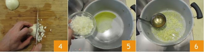 Nun bereiten Sie das Sofritto zu: hacken Sie die Zwiebel 1, dann geben Sie in einen großen Topf das Öl und fügen Sie die gehackte Zwiebel hinzu 5. Lassen Sie sie etwa zehn Minuten dünsten und geben Sie bei Bedarf mit einer Kelle heiße Brühe hinzu, um ein Anbrennen zu vermeiden 6.