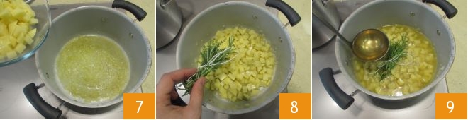Nach 10 Minuten fügen Sie die Kartoffelwürfel hinzu 7. Dann binden Sie die Thymian- und Rosmarinzweige (einen Thymianzweig zur Seite legen) mit Küchengarn zusammen und geben Sie sie in den Topf 8. Bedecken Sie alles mit der kochenden Brühe 9 und lassen Sie es 20 Minuten kochen.