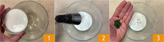 Um das Kartoffelpavé mit Tzatziki-Sauce zuzubereiten, gießen Sie zuerst die frische Sahne in eine Schüssel 1, dann würzen Sie mit Salz, Pfeffer 2 und Thymian 3.