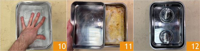 Nach der letzten Schicht fügen Sie die Butterstückchen oben hinzu und bedecken Sie sie mit einem Blatt Backpapier 10. Backen Sie im vorgeheizten Umluftofen bei 160° für 50 Minuten. Nach dieser Zeit herausnehmen und abkühlen lassen. Sobald es abgekühlt ist, legen Sie eine etwas kleinere Backform darauf, sodass sie die Kartoffeln berührt 11, platzieren Sie Gewichte (zum Beispiel Fleischklopfer) darauf 12 und stellen Sie es für etwa 12 Stunden in den Kühlschrank.