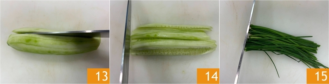 Um die Tzatziki-Sauce zuzubereiten, schälen Sie die Gurke und schneiden Sie sie zuerst in Scheiben 13 und dann in sehr kleine Würfel 14. Hacken Sie den Schnittlauch fein 15.